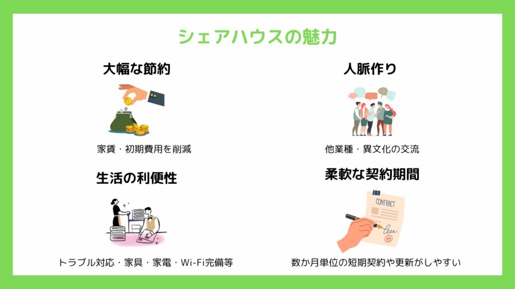 特に転勤や上京、短期間の滞在など、生活の拠点を素早く整えたい社会人にとっては大きなメリットがあります。また、同世代との交流や人脈作りの場としても魅力的で、孤独感を感じにくい点も評価されています。一方で、共用スペースや生活リズムの違いに伴う注意点も存在します。