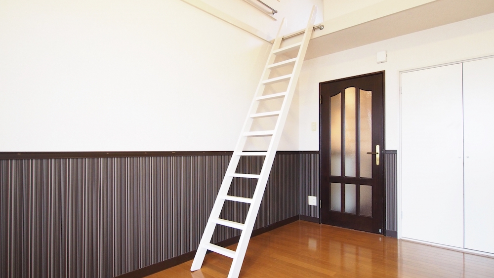 ロフトとは、天井の高い部屋の一部に設けられた中二階のようなスペースを指します。一般的に、はしごや簡易階段で昇り降りし、主に収納や就寝スペースとして使われます。