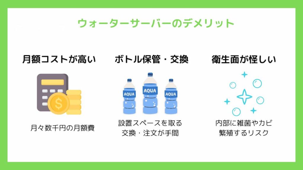 ウォーターサーバーは、常に水を保温・冷却している状態なので、内部に雑菌やカビが繁殖するリスクもあります。