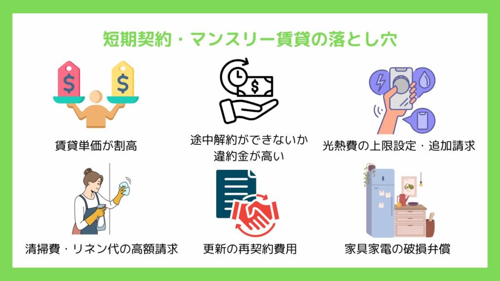 短期契約・マンスリー賃貸は便利な反面、通常の賃貸契約とは異なるルールが多く、契約内容をきちんと理解しないと予想外の出費やトラブルになることがあります。ここでは特に注意すべきポイントを紹介します。