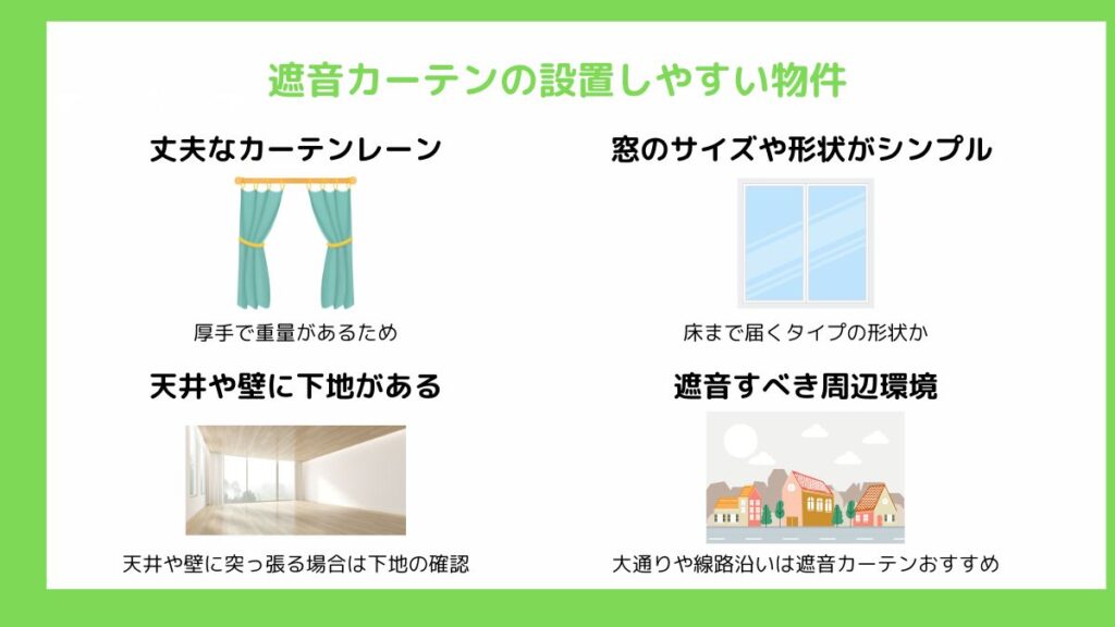 遮音カーテンは賃貸でも導入しやすい防音対策ですが、物件によっては効果が十分に発揮できなかったり、設置自体が難しい場合もあります。ここでは、遮音カーテンを活用しやすい物件の特徴を解説します。