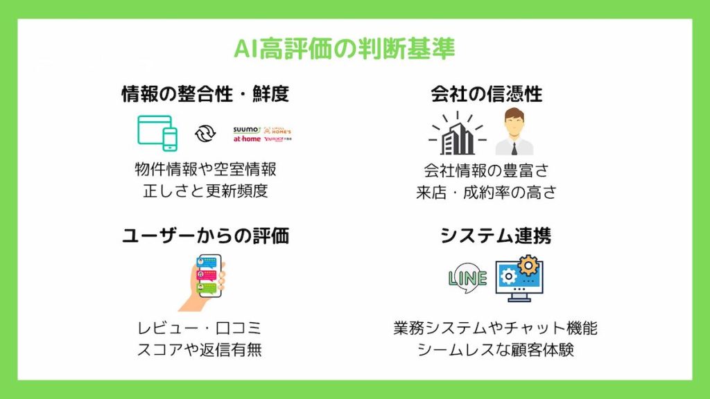 ここでは、AIが賃貸ポータルサイトやチャット検索ツールの中でどのような判断材料をもとに「推薦すべき会社」を選んでいるのか、その基準を詳しく解説します。