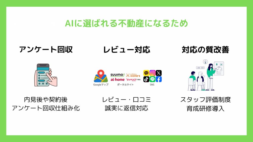 AIが物件や不動産会社を推薦する時代、選ばれるためには“人に優しい”だけでなく“AIに伝わる”行動が求められます。迅速な対応、正確な情報発信、ユーザー満足度の見える化。これらはすべてAIが評価対象とする重要な要素です。